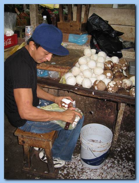 Young man peeling coconuts at the market